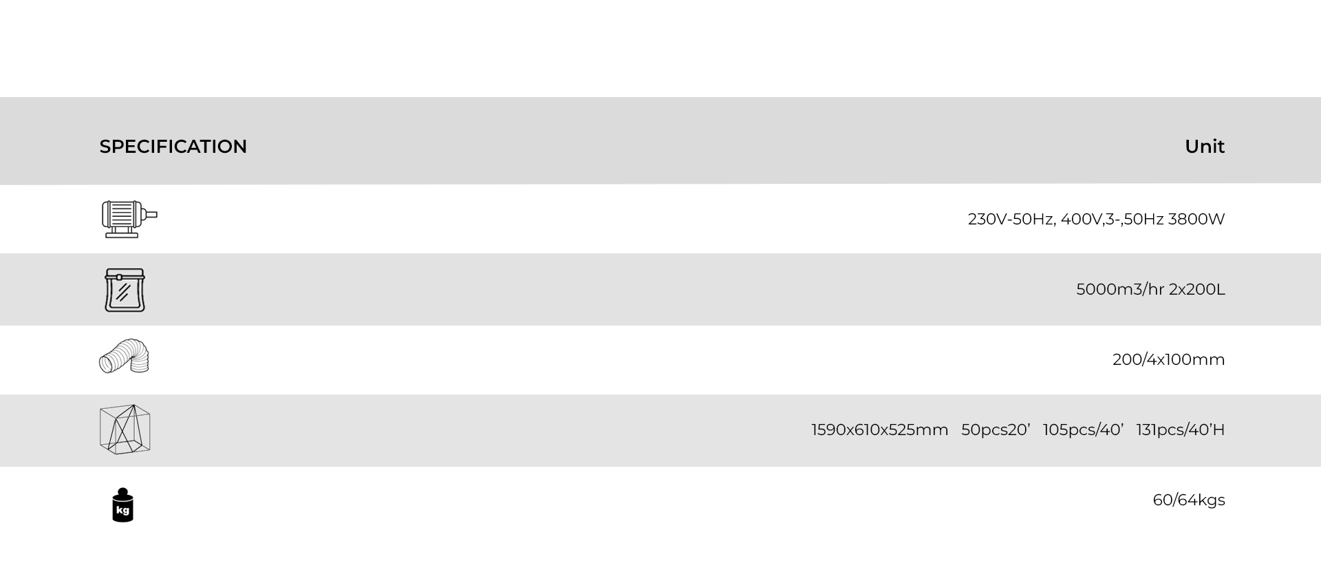 The ABS5000 is a high-capacity dust collector designed to keep your workshop clean, safe, and efficient. Built for demanding environments, this unit provides powerful suction performance to effectively capture fine dust and wood chips at the source — improving both air quality and machine longevity.