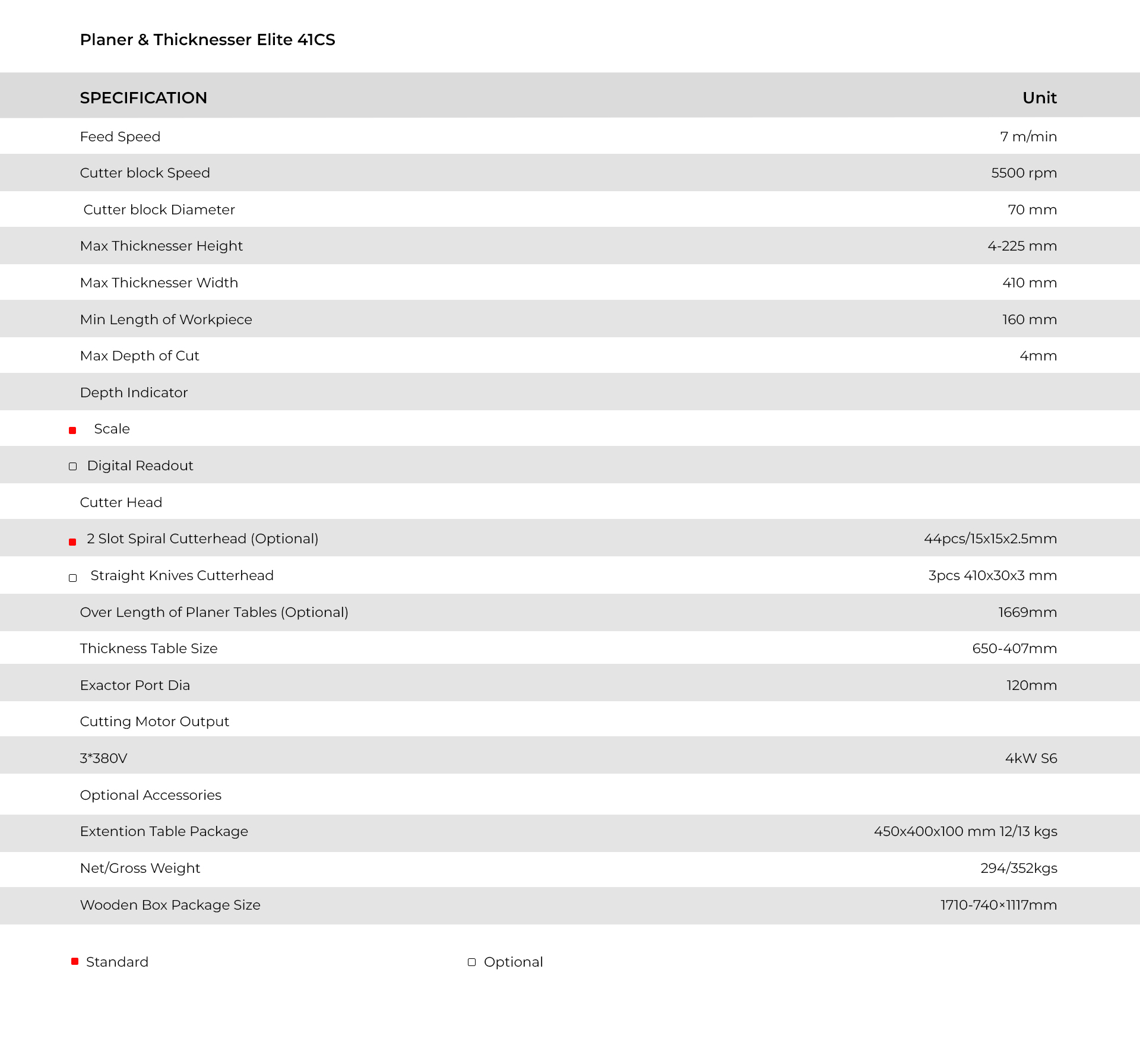 The planer and thicknesser 16 Elite 41CS are a high-performance designed to meet the demands of serious woodworkers and busy trade workshops. With a generous working capacity of 410mm (width) x 255mm (height), it easily handles larger timber sections with precision and ease.